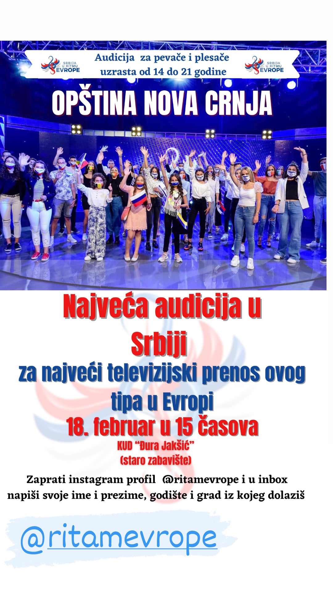 Audicija za najveće regionalno muzičko takmičenje dece i mladih starosti od 14 do 21 godine biće održana Srpskoj Crnji u četvrtak, 18. februara sa početkom u 15 sati, u Kulturno-umetničkom društvu „Đura Jakšić“. Prijavljivanje se vrši putem Instagram profila @ritamevrope, a potrebno je poslati ime, prezime, godište i grad.
